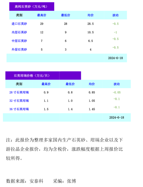 中國粉體網訊 6月18日,硅業分會發布國內高純石英砂、石英坩堝價格信息,其中高純石英砂均價較上周下降0.5-1萬元/噸左右,石英坩堝均價較上周下降0.05-0.1萬元/只左右。