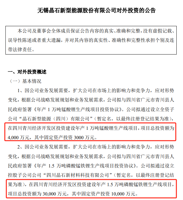 中國粉體網訊 6月18日,晶石能源發布公告,因公司業務發展需要,擴大公司在市場上的影響力和競爭力,應對形勢變化,根據公司戰略發展規劃和業務發展需求,公司擬與四川省廣元市青川縣人民政府簽署《年產1萬噸錳酸鋰生產線項目投資協議》、《年產1.5萬噸磷酸錳鐵鋰生產線項目投資協議》,總投資3.4億元。