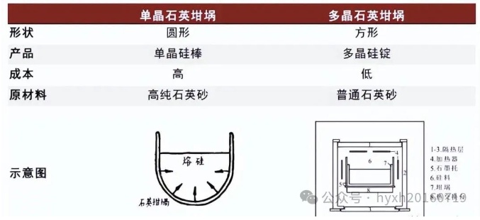 半導體石英坩堝主要用于生長半導體單晶硅,用于制造集成電路、微電子器件等;光伏石英坩堝主要用于生長光伏單晶硅,用于制造太陽能電池、光伏組件等。