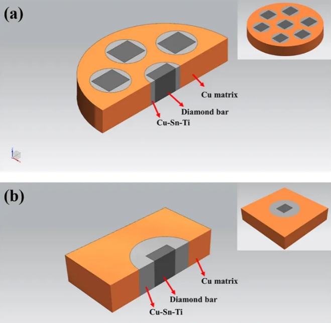 (a)新型金剛石/Cu復合材料的三維示意圖; (b)單個鉆石棒插入單個孔中的金剛石/Cu復合材料的示意圖
