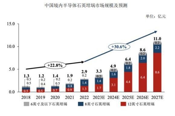 從需求端來(lái)看,2022年中國(guó)境內(nèi)半導(dǎo)體石英坩堝需求量占全球需求總量的15.93%。隨著中國(guó)半導(dǎo)體硅片產(chǎn)業(yè)的蓬勃發(fā)展,中國(guó)境內(nèi)半導(dǎo)體石英坩堝市場(chǎng)需求也將快速上升,據(jù)中金企信預(yù)測(cè),2027年中國(guó)境內(nèi)半導(dǎo)體坩堝市場(chǎng)規(guī)模有望從2022年的2.9億元增長(zhǎng)至11億元,年復(fù)合增長(zhǎng)率30.6%。