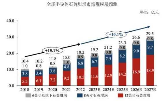在半導(dǎo)體石英坩堝領(lǐng)域,國(guó)外半導(dǎo)體產(chǎn)業(yè)逐漸轉(zhuǎn)移至國(guó)內(nèi),隨著新能源車(chē)、智能電網(wǎng)、自動(dòng)駕駛、人工智能的發(fā)展,8 英寸及 12 英寸半導(dǎo)體硅片出貨量持續(xù)增長(zhǎng),我國(guó)半導(dǎo)體硅片供應(yīng)商開(kāi)始加碼大硅片產(chǎn)能布局,對(duì)半導(dǎo)體石英坩堝的需求持續(xù)增加,預(yù)計(jì)至 2027 年,全球半導(dǎo)體石英坩堝市場(chǎng)規(guī)模將擴(kuò)大至 29.5 億人民幣,期間年復(fù)合增長(zhǎng)率為 10.1%。目前,國(guó)內(nèi)個(gè)別企業(yè)開(kāi)展了 32 英寸半導(dǎo)體級(jí)石英坩堝的研發(fā)工作并具備量產(chǎn)能力。