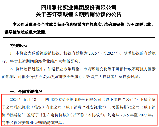 6月20日,雅化集團發(fā)布公告,其下屬全資子公司雅化鋰業(yè)(雅安)有限公司(以下簡稱“雅安鋰業(yè)”)已與美國特斯拉公司(以下簡稱“特斯拉”)成功簽署了一份《生產(chǎn)定價協(xié)議》。根據(jù)協(xié)議內(nèi)容,特斯拉將從2025年起至2027年,連續(xù)三年從雅安鋰業(yè)采購碳酸鋰產(chǎn)品,以滿足其電池生產(chǎn)需求。