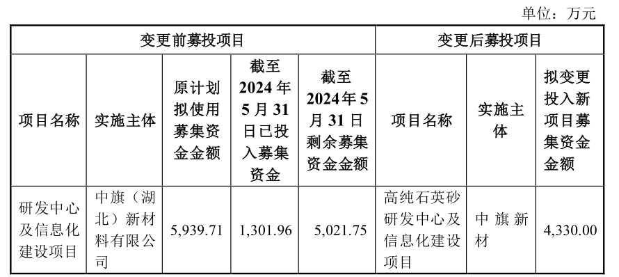 中國粉體網(wǎng)訊 近日,中旗新材發(fā)布公告,公司擬將首發(fā)募集資金投資項(xiàng)目“研發(fā)中心及信息化建設(shè)項(xiàng)目”剩余的募集資金用途變更為“高純石英砂研發(fā)中心及信息化建設(shè)項(xiàng)目”。本次變更的募集資金金額為4330萬元。