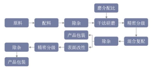干法研磨是將硅微粉原料放進球磨機或振動磨中研磨,該研磨工藝可以連續進料和出料,也可以一次投入若干重量原料,連續研磨若干時間后出料;出料時要經過微粉分級機控制粒度,粗的產物返回磨機再磨或作為產品,細的則是產品。干法研磨要嚴格控制入磨物料水分,產品不再干燥。