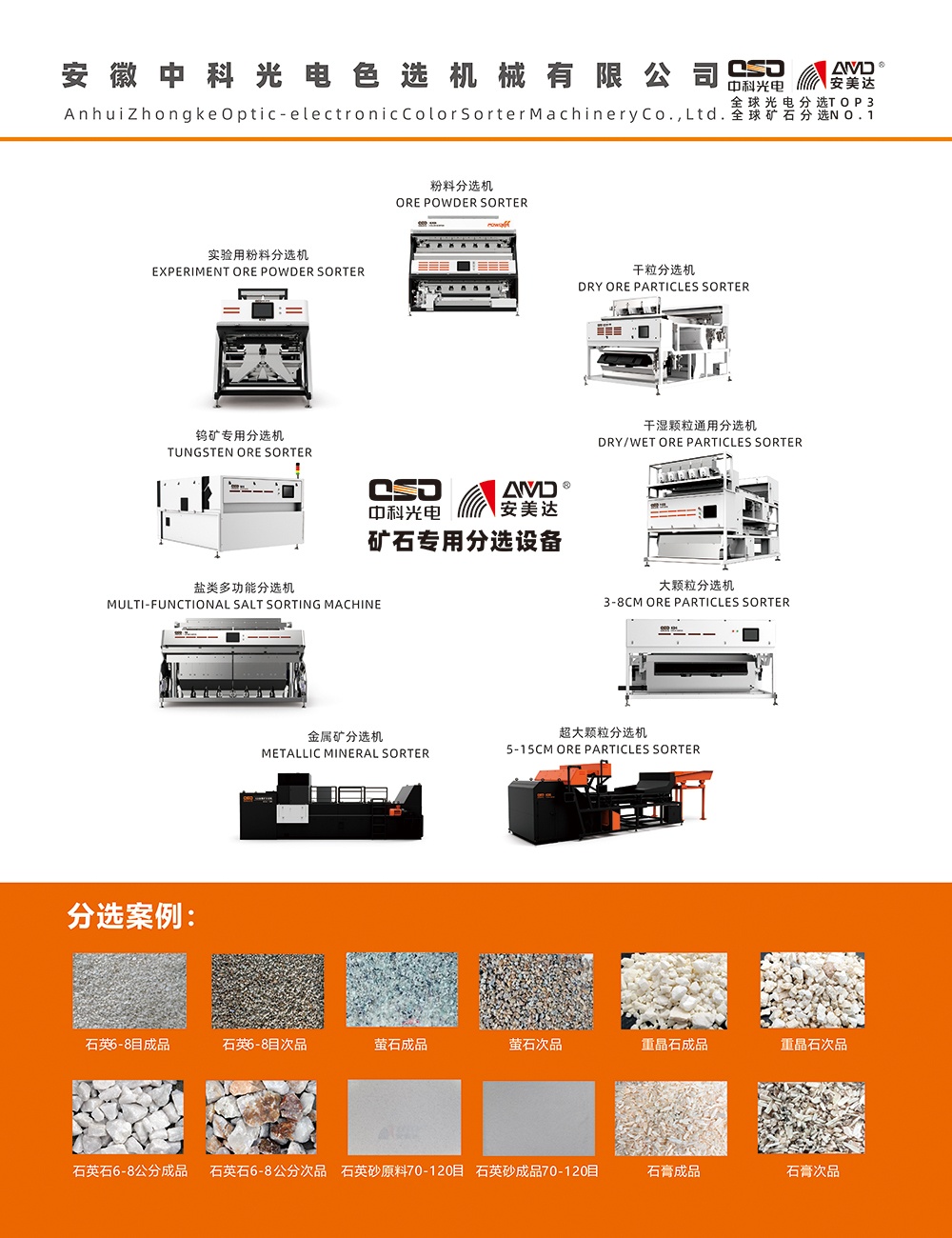 安徽中科光電色選機械有限公司坐落于中國合肥,占地面積15萬平方米,總投資4.5億,員工人數760多人,科研樓25000平方米,是一家專業從事智能分選設備研發、生產、銷售的高新技術企業。歷經十多年的發展,已成為擁有員工超600人,銷售收入逾5億元的大型智能分選設備生產基地。 公司全面通過了質量管理體系認證、環境管理體系認證、職業健康管理體系認證,“安美達”系列產品通過了歐盟CE認證。嚴格的質量管理體系保障了公司產品和服務的質量,在全國乃至世界打響了“安美達”品牌。“色選,我們無處不在”是中科光電對于色選技術的追求和承諾。“安美達”牌系列智能色選機市場份額位列三甲,并成功遠銷一百多個國家和地區。 公司成立專門研發中心并被認定授予“安徽省企業技術中心”和“博士后科研工作站”,且與合肥工業大學共建智慧辨識與分揀工程技術中心。先后獲得自主知識產權近48項,高新技術產品6項,并參與制定3項安徽省地方標準。“安美達”品牌被認定為“中國馳名商標”、“安徽省著名商標”。公司先后被認定為“國家高新技術企業”、“安徽省知識產權優勢企業”、“合肥市知識產權示范企業”、“合肥市兩化融合示范企業”、“合肥市創新型企業”。