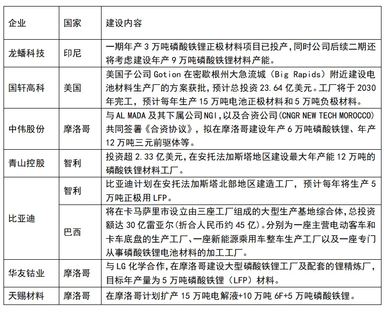 當前,海外市場磷酸鐵鋰正極材料布局尚處于初期階段,產能尚未釋放,陸續有材料廠出海建廠。