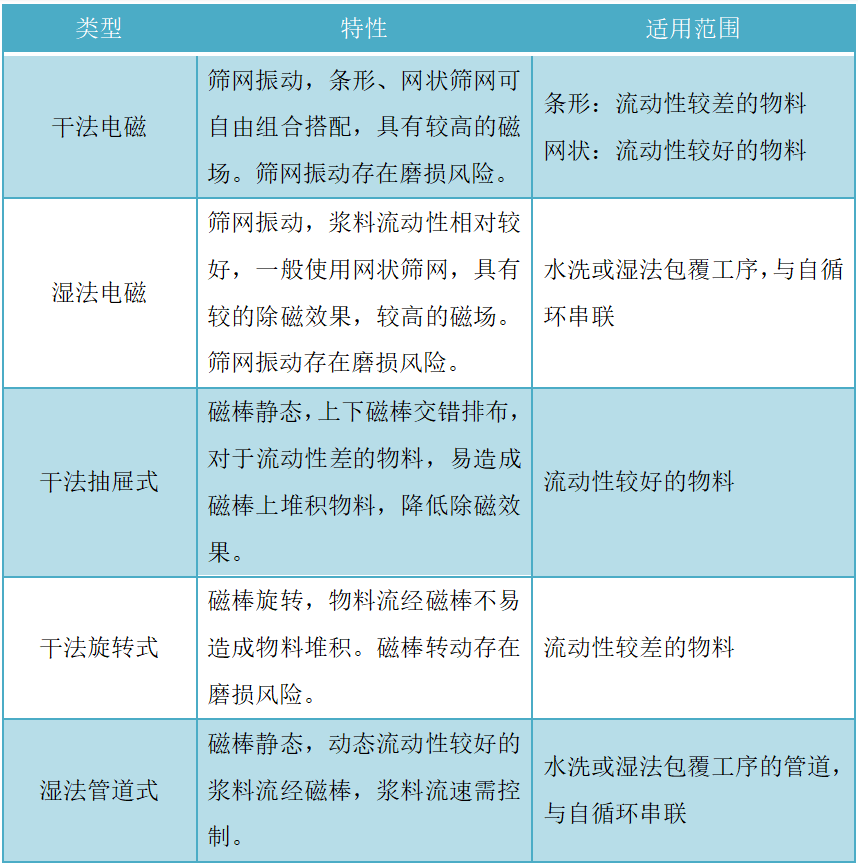 針對(duì)不同的工序,使用到的除鐵器類型有干法抽屜式、干法旋轉(zhuǎn)式、濕法管道式等。