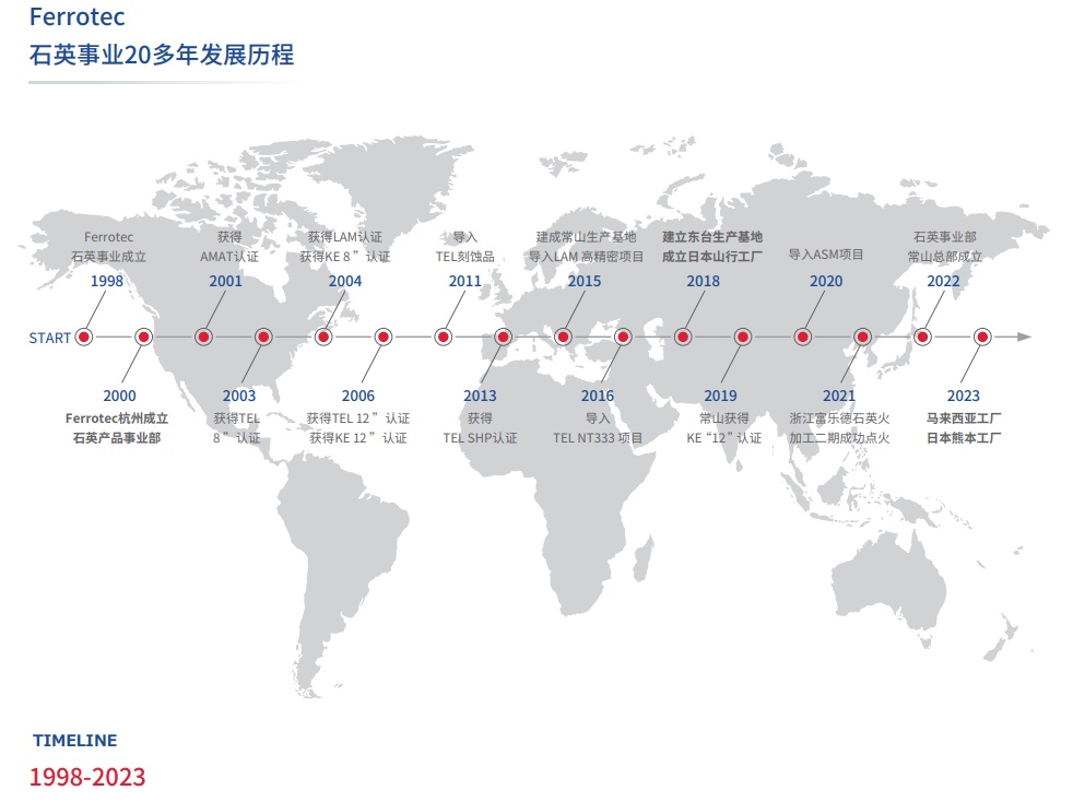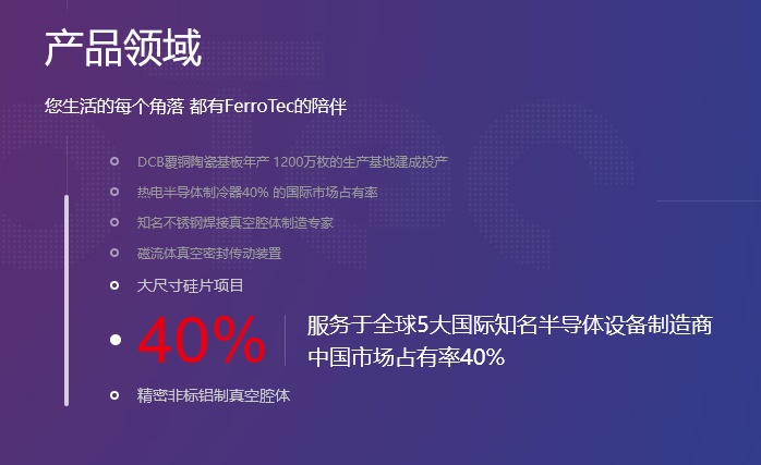 由日本磁性技術控股有限公司于1992年在華設立的企業——FerroTec(中國),其石英制品服務于全球5大國際知名半導體設備制造商,且相關產品據其官網宣傳在中國市場的占有率高達40%。這樣一家全球石英制品領導者卻長期以來不為大多數人所了解。據悉,該公司專業從事半導體硅片、熱電半導體致冷材料與器件、半導體石英制品、精密陶瓷制品、半導體真空傳動裝置及大型腔體、電子束蒸發鍍膜機、精密洗凈、覆銅陶瓷基板(DCB、AMB、DPC)、半導體裝備、單晶爐等產品的研發、制造和銷售。