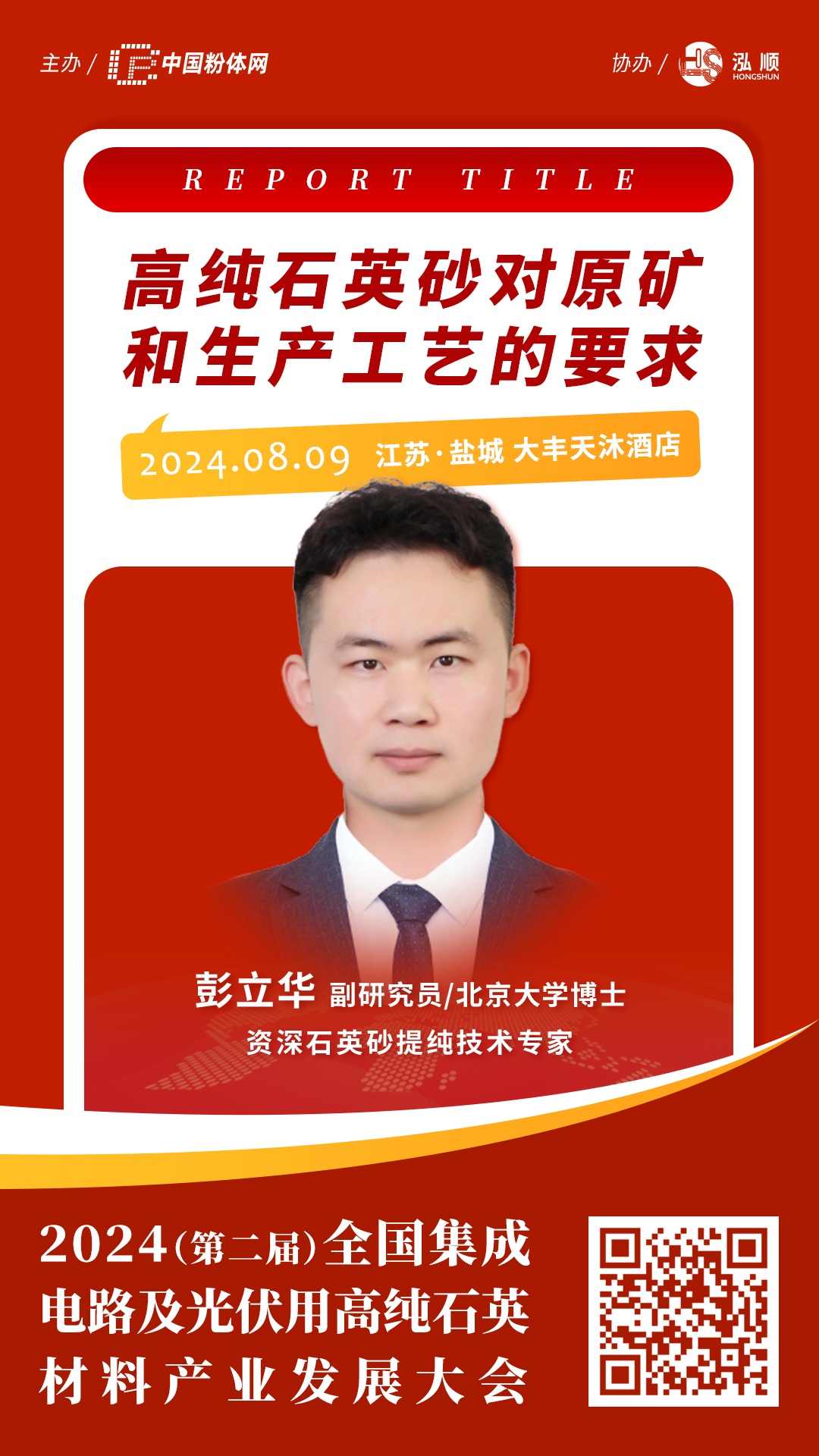 2024年8月9日,由中國粉體網主辦的“2024(第二屆)全國集成電路及光伏用高純石英材料產業發展大會”將在江蘇鹽城召開,資深石英砂提純技術專家彭立華將做《高純石英砂對原礦和生產工藝的要求》的報告,彭立華,2019年北京大學地質學(材料及環境礦物學)博士畢業,現任浙江潤優新材料科技有限公司研發總監,深耕高純石英砂及其制品產業化技術研究十年,屆時,他將詳細分析石英礦物中的包裹體雜質、礦物雜質、晶格雜質等因素和提純技術對高純石英砂生產的影響。