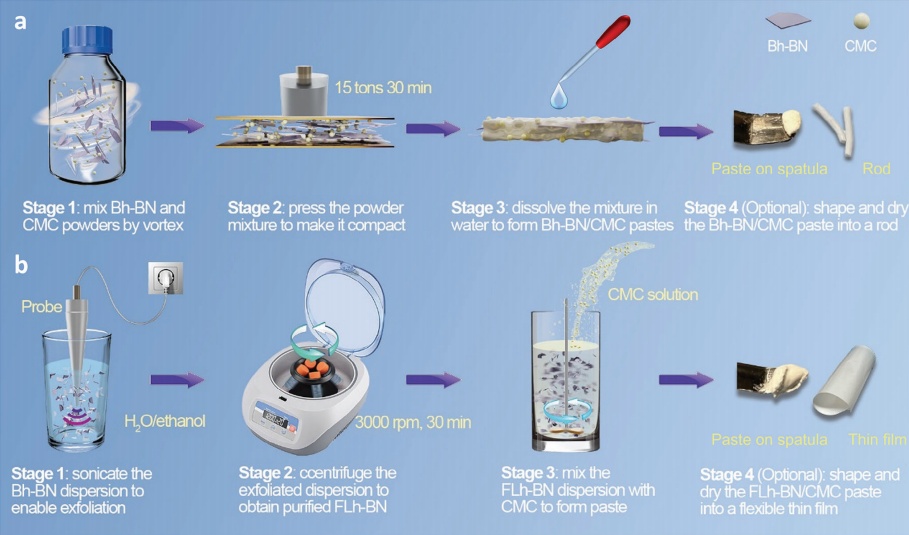 倫敦帝國理工學院Felice Torrisi團隊研究采用成本效益高、可擴展的方法制備了一種嵌入少層h-BN (FLh-BN)薄片的纖維素基復合材料,其熱導率為21.7 W/(mK)。該值比嵌套h-BN的復合材料的熱導率高5倍以上,說明FLh-BN優越的熱導率對h-BN聚合物復合材料熱導率的好處。