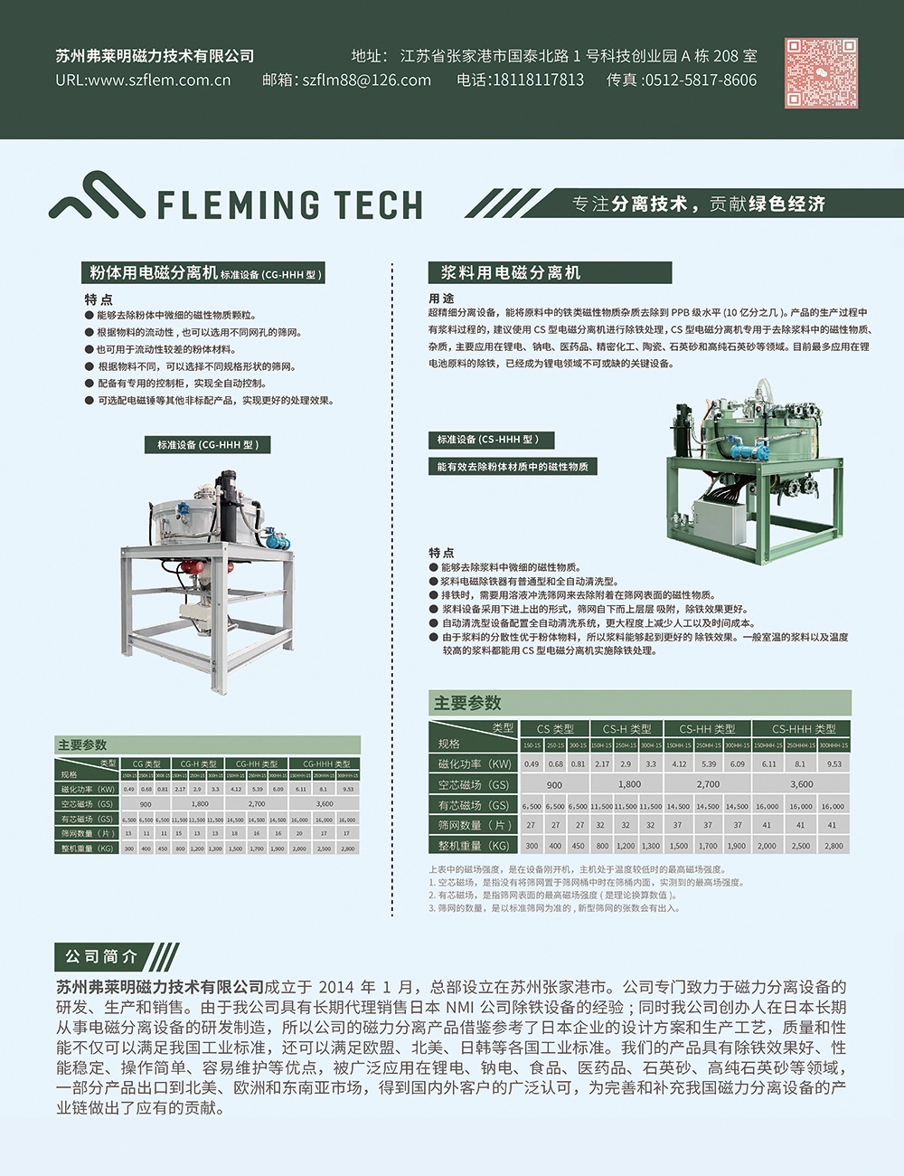 蘇州弗萊明磁力技術有限公司成立于2014年1月,總部設在江蘇省蘇州張家港市。公司主要致力于磁力分離設備的研發、生產和銷售,同時代理日本NMI公司的電磁分離設備,是日本NMI公司中國大陸地區的總經銷商。我公司的永磁分離產品,采用日本公司的設計方案和生產工藝,質量和性能均可滿足日本的行業標準。我們的產品具有除鐵效果好、性能穩定、操作簡單、容易維護等優點,被廣泛應用在我國的化工、食品和醫藥品等領域,同時出口日本、韓國、北美和東南亞市場,并得到國內外用戶的廣泛認可。 公司自創建以來,就和日本公司合作,開展永磁新產品的研發和生產活動。到目前為止,我們已經研發了三個系列多種型號新型永磁分離產品并推向市場,為完善和補充我國的磁力分離設備產業鏈做出了應有的貢獻。