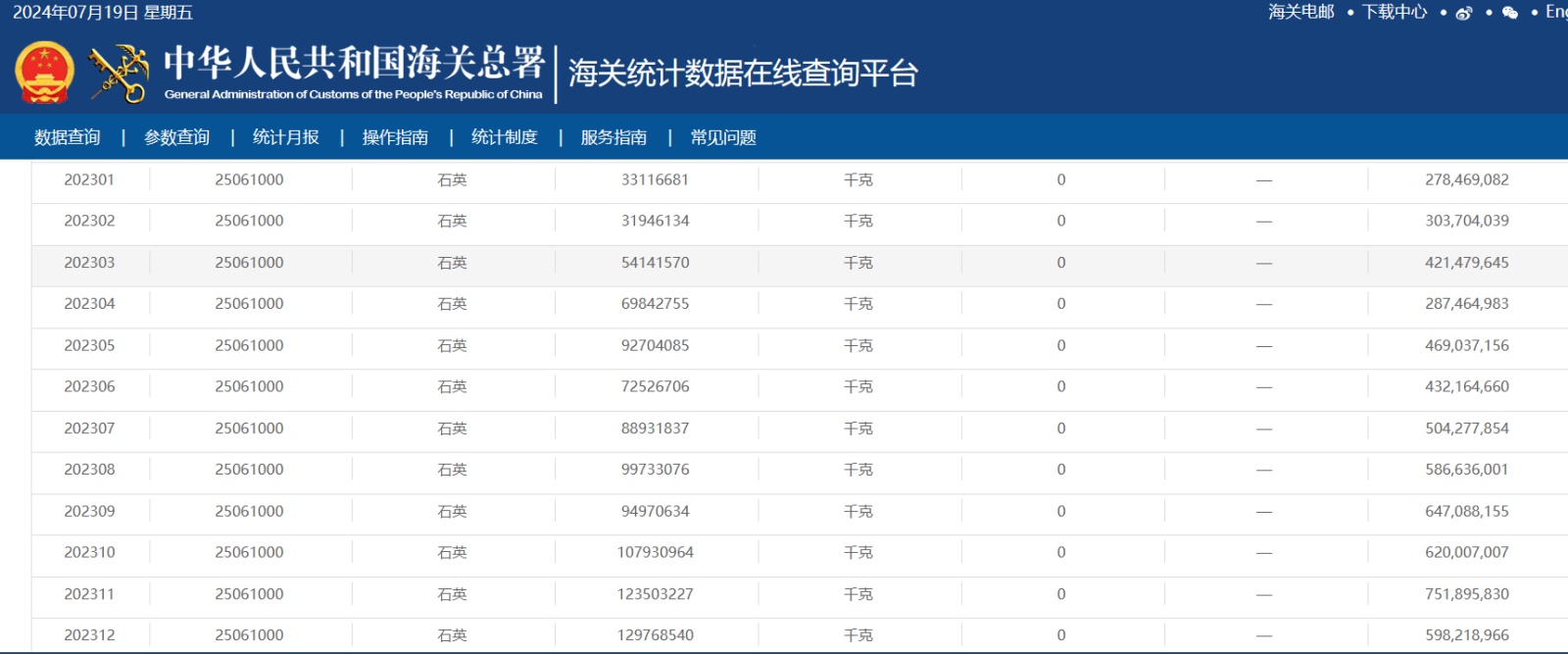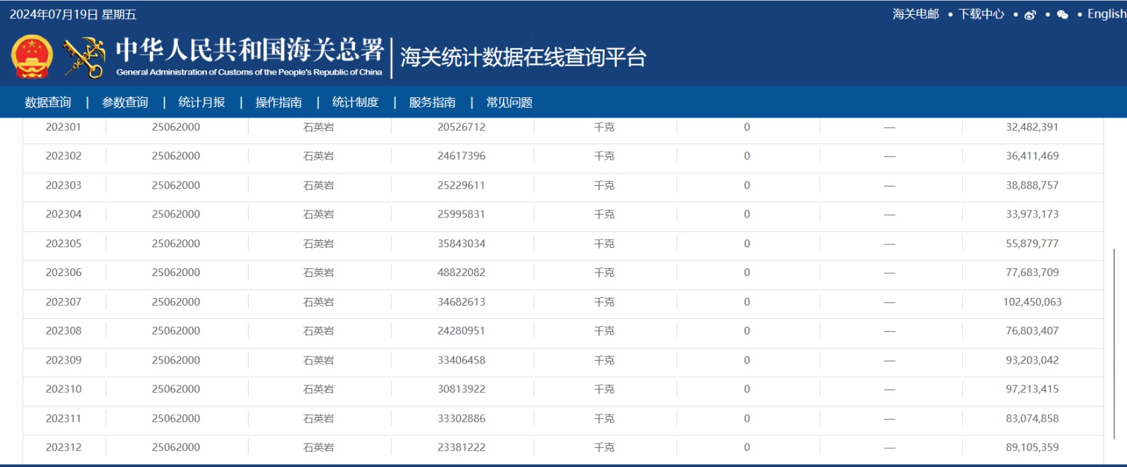我們從海關總署查詢到2023年一年進口“石英”(商品編碼:25061000)總數量為93萬噸,總金額為59億,進口石英均價為6300元/噸。