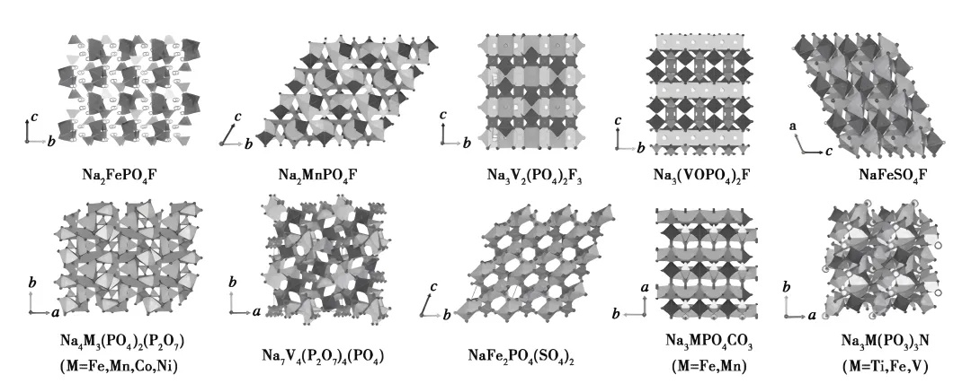 圖:幾種鈉離子電池聚陰離子型正極材料晶體結構示意圖