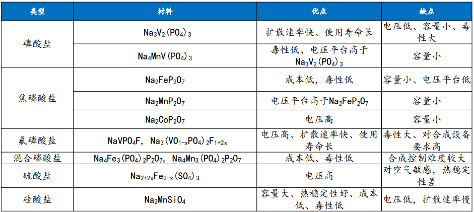 圖:不同類型的聚陰離子類化合物正極優缺點
