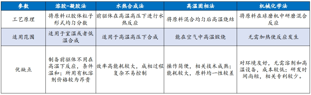 此外,制備高性能的聚陰離子型正極材料的工藝復雜,造成其合成成本較高,需要進一步研究和優化。目前主流制備方法為高溫固相法、溶膠-凝膠法、水熱法、機械化學法等。
