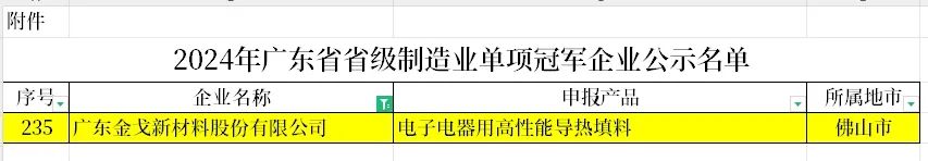 中國粉體網(wǎng)訊 近日,廣東省工業(yè)和信息化廳公布了2024年廣東省省級制造業(yè)單項冠軍企業(yè)通過名單,廣東金戈新材料股份有限公司(以下簡稱金戈新材)依托“電子電器用高性能導(dǎo)熱填料”產(chǎn)品成功入選。