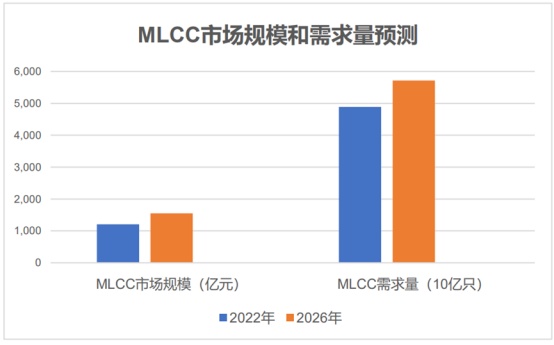 根據(jù)CECA數(shù)據(jù),2022年全球MLCC市場規(guī)模為1,204億元,2026年有望達(dá)到1,547億元,2022-2026年CAGR為6.5%。從需求量看,2022年全球MLCC需求量為48,890億只,2026年有望達(dá)到57,110億只,2022-2026CAGR為4.0%。