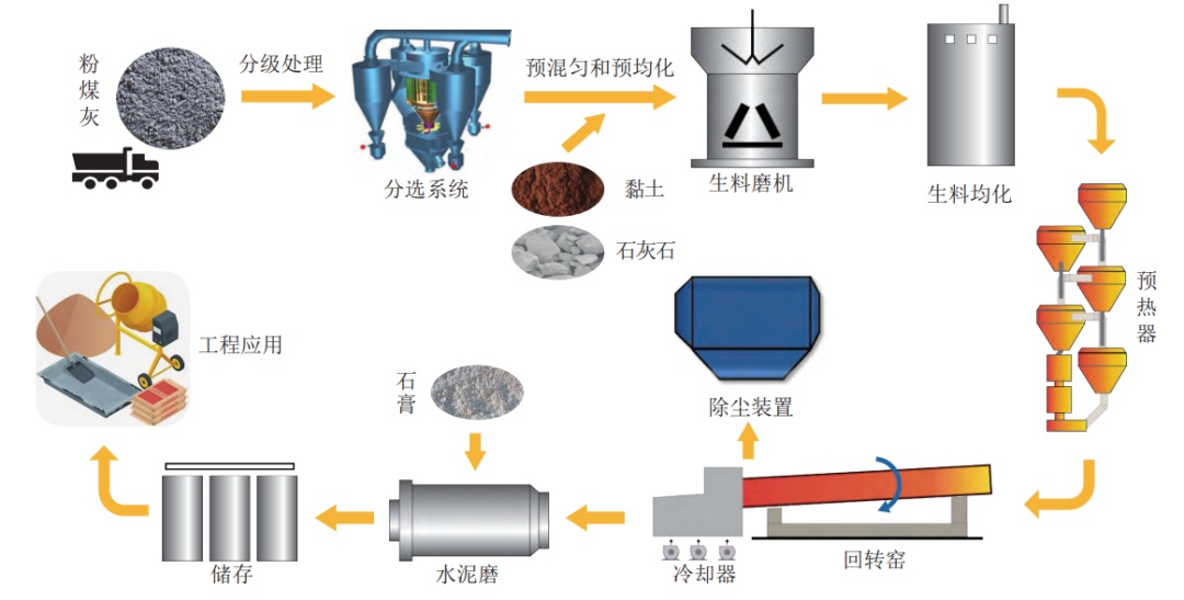 利用粉煤灰生產水泥熟料是早期國內外粉煤灰綜合利用途經之一,粉煤灰的化學組成與黏土(主要為SiO2和Al2O3)相似,因而可替代黏土進行水泥生料組分配伍,用于水泥熟料生產。粉煤灰中的殘余碳可在熟料燒制過程中作為燃料,從而減少燃料的消耗。