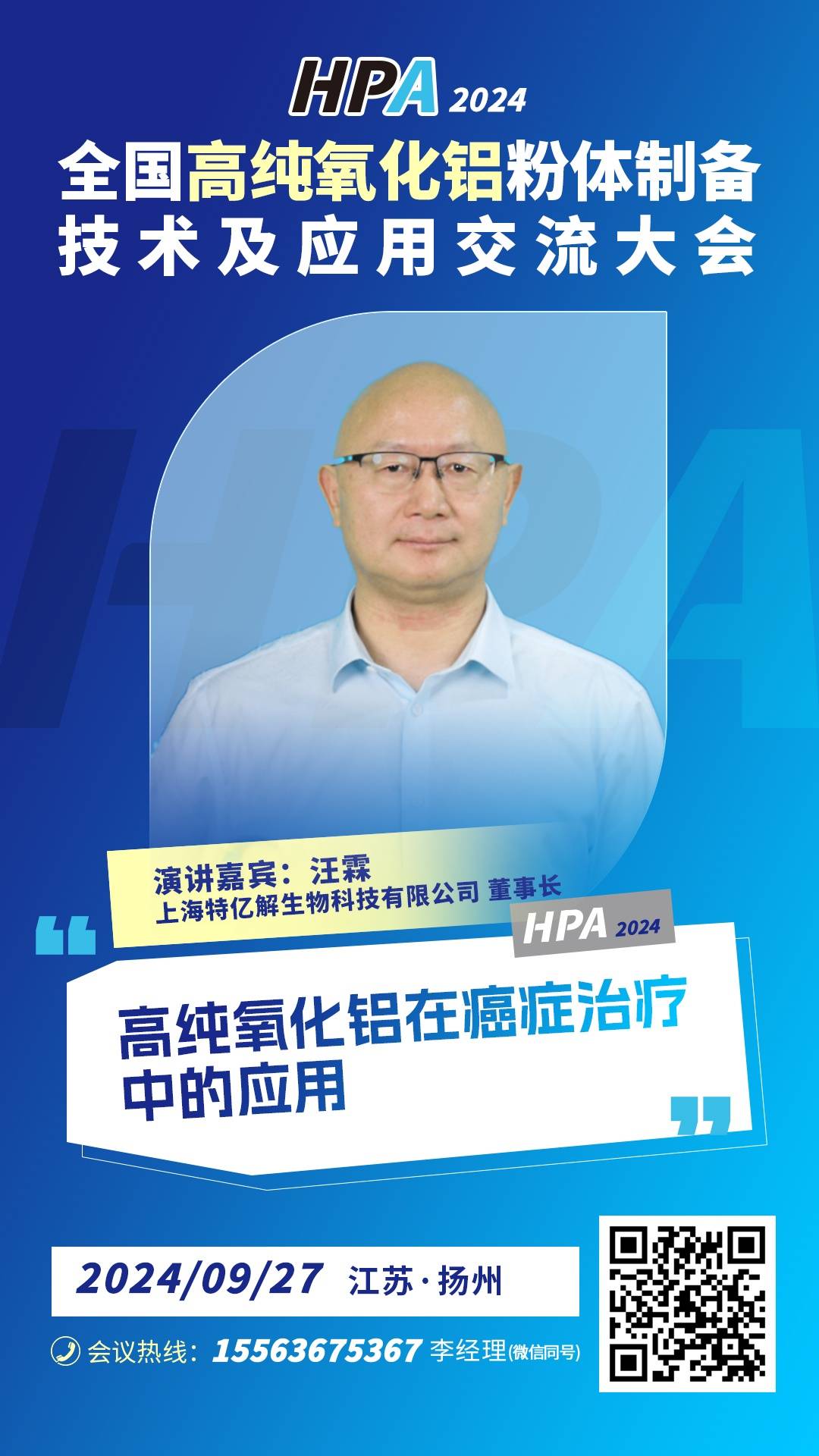 9月27日,中國粉體網將在江蘇·揚州舉辦2024全國高純氧化鋁粉體制備技術及應用交流大會。我們邀請到上海特億解生物科技有限公司汪霖董事長出席本次大會并作題為《高純氧化鋁在癌癥治療中的應用》的報告,屆時,汪董將現場解說這場高純氧化鋁的跨界演出。