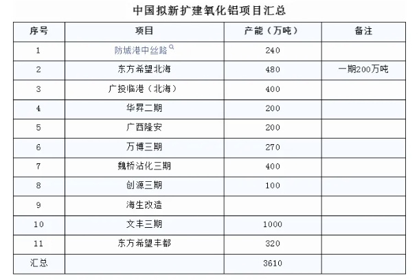 中國(guó)新、擴(kuò)建氧化鋁產(chǎn)能(國(guó)內(nèi)外)超5000萬(wàn)噸!