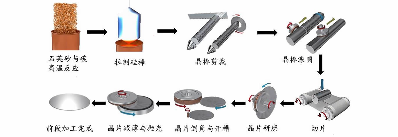 單晶硅半導體材料的前端加工工藝及使用的金剛石工具如上圖所示,在200℃下,石英砂與碳發生置換反應得到單晶硅,后經直拉法或區熔法得到單晶硅棒。