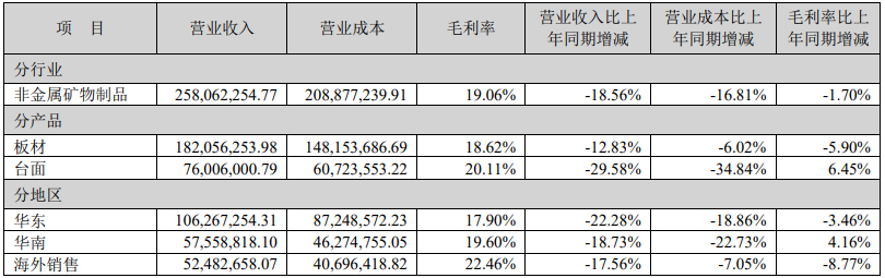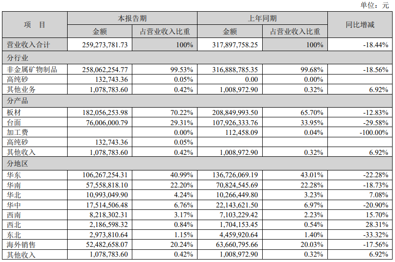 截至報告期末,公司及控股子公司現有中國發明專利30項,美國發明專利2項,實用新型專利64項,計算機軟件著作權12項,是《人造石(JC/T 908-2013)》、《建筑裝飾用人造石英石板(JG/T 463-2014)》、《樹脂型合成石板材(GB/T 35157-2017)》等行業標準的主編或參編單位。公司生產的石英石產品已通過美國ASTM標準檢測、美國NSF認證等多個國家或地區的權威標準認證,產品遠銷北美洲、大洋洲、亞洲、歐洲等地。