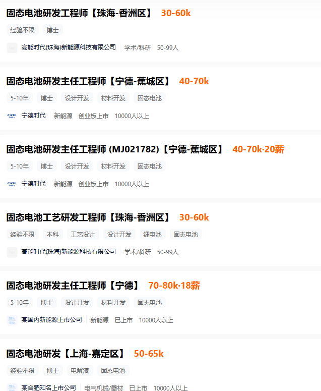 據了解,寧德時代在招聘固態電池研發專家時,開出的工資為100-300萬,且要求具有5年以上固態電池相關項目開發經驗,博士以上學歷,海外博士相關優先。所以高薪和學歷以及工作經驗也是密切相關的。