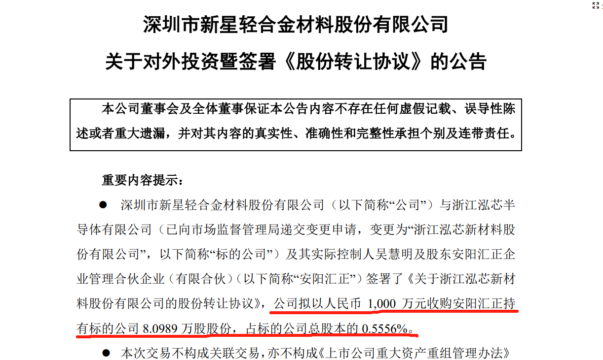 中國粉體網訊 近日,深圳新星發布公告,公司擬以1000萬元收購安陽匯正持有的浙江泓芯半導體有限公司(浙江泓芯新材料股份有限公司,以下簡稱“浙江泓芯”)8.0989萬股股份,開展高純氧化鋁方面的業務合作。