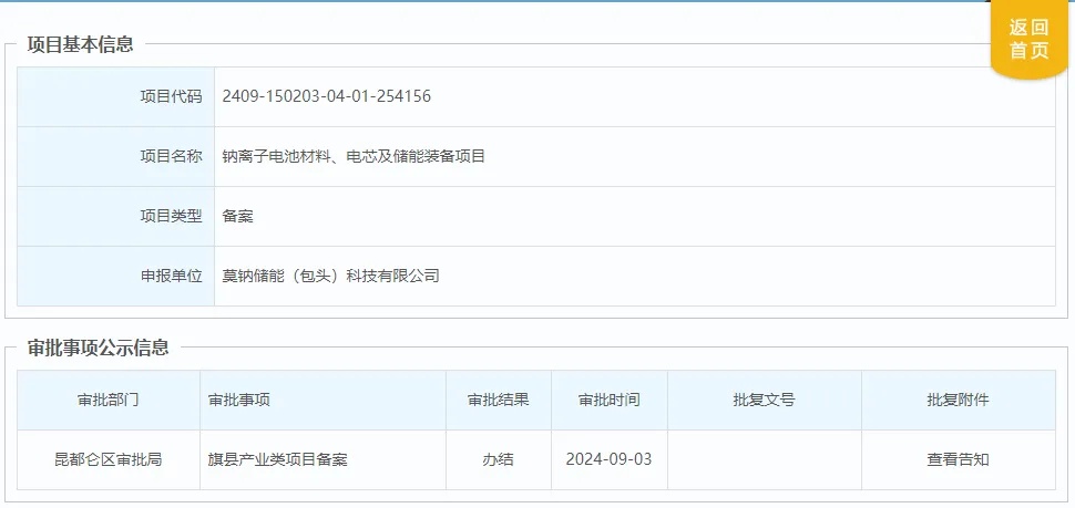 9月3日,內(nèi)蒙古又一鈉離子電池材料、電芯及儲能裝備項(xiàng)目備案通過。