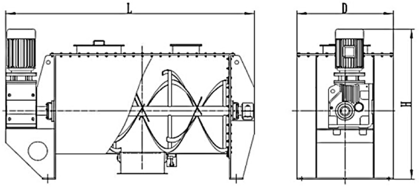 臥式螺旋帶式混合機一般簡稱為臥式螺帶混合機,是應用最普遍的間歇式固定容器型混合機。臥式螺帶混合機主要由電動機、傳動機構、螺旋帶、混合容器和機架等組成。