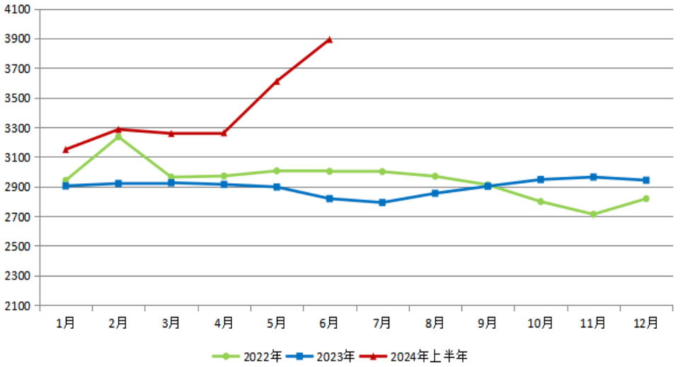 國(guó)內(nèi)市場(chǎng)方面,受2023年末幾內(nèi)亞油庫(kù)爆炸、國(guó)內(nèi)河南、山西部分鋁土礦停產(chǎn),以及河北、山東氧化鋁廠因重污染天氣停產(chǎn)、減產(chǎn)的影響,市場(chǎng)對(duì)鋁土礦供應(yīng)的擔(dān)憂及氧化鋁企業(yè)的大范圍減產(chǎn)導(dǎo)致氧化鋁價(jià)格在1月份快速上行。春節(jié)之后至4月上旬,國(guó)內(nèi)氧化鋁價(jià)格進(jìn)入平臺(tái)期,價(jià)格略有下降,但整體降幅不大。4月中旬至5月,國(guó)內(nèi)氧化鋁價(jià)格進(jìn)入第二個(gè)快速上漲階段,在宏觀數(shù)據(jù)推動(dòng)下大宗商品價(jià)格集體上漲,大量資金涌入期貨市場(chǎng),推動(dòng)現(xiàn)貨市場(chǎng)價(jià)格不斷走高,尤其在力拓集團(tuán)就其澳大利亞兩家氧化鋁廠發(fā)貨發(fā)布不可抗力公告后,主力合約強(qiáng)勢(shì)漲停,價(jià)格創(chuàng)歷史新高,帶動(dòng)現(xiàn)貨價(jià)格達(dá)到上半年高點(diǎn)。進(jìn)入6月份,隨著期貨價(jià)格回落,氧化鋁現(xiàn)貨成交明顯下降,現(xiàn)貨價(jià)格再度進(jìn)入平臺(tái)期。2024年上半年,國(guó)內(nèi)氧化鋁現(xiàn)貨價(jià)格最高為3,917元/噸,最低為3,156元/噸,均價(jià)3,504元/噸,同比上漲21.0%。