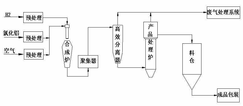 氣相法合成氧化鋁的工藝過程包括以下工序:氯化鋁AlCl3的升華、反應前各反應物的預處理、合成爐中燃燒水解、聚集、氣固分離、HCl的解吸、包裝、廢氣處理。