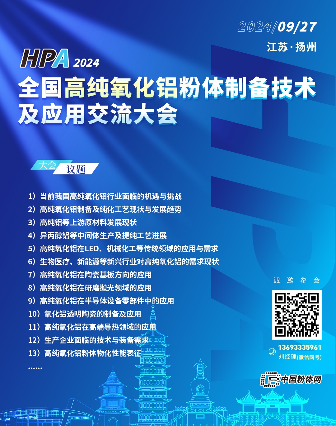 從2024全國高純氧化鋁粉體制備技術及應用交流大會組委會獲悉,本屆會議將于2024年9月27日在江蘇揚州舉辦。江西寶弘納米科技有限公司作為參展單位邀請您共同出席。