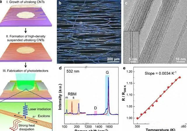 圖1.基于超長碳納米管懸空網絡的光電探測器的制備和表征