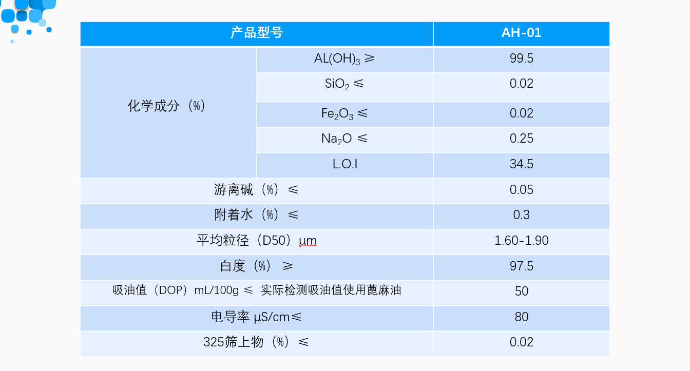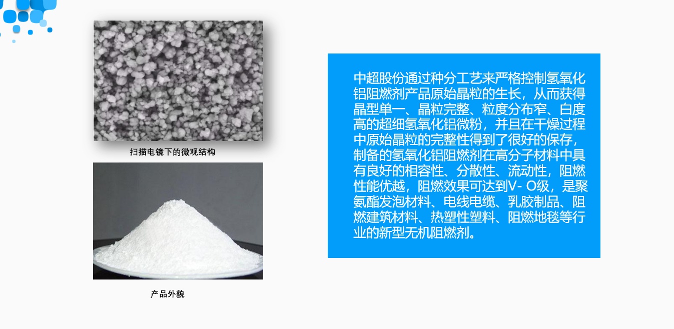 主要產(chǎn)品為以超細氫氧化鋁阻燃劑為代表的的低煙無鹵阻燃材料;依托在鋁基材料領域積累的技術(shù)經(jīng)驗,以自產(chǎn)的超細氫氧化鋁為優(yōu)質(zhì)前驅(qū)體進一步加工生產(chǎn)的新能源電池涂覆材料;電子通訊功能填充材料;精細拋光磨料等產(chǎn)品。公司掌握超細氫氧化鋁阻燃劑制備相關(guān)技術(shù)核心技術(shù),是國內(nèi)低煙無鹵阻燃材料的開拓者與引領者。