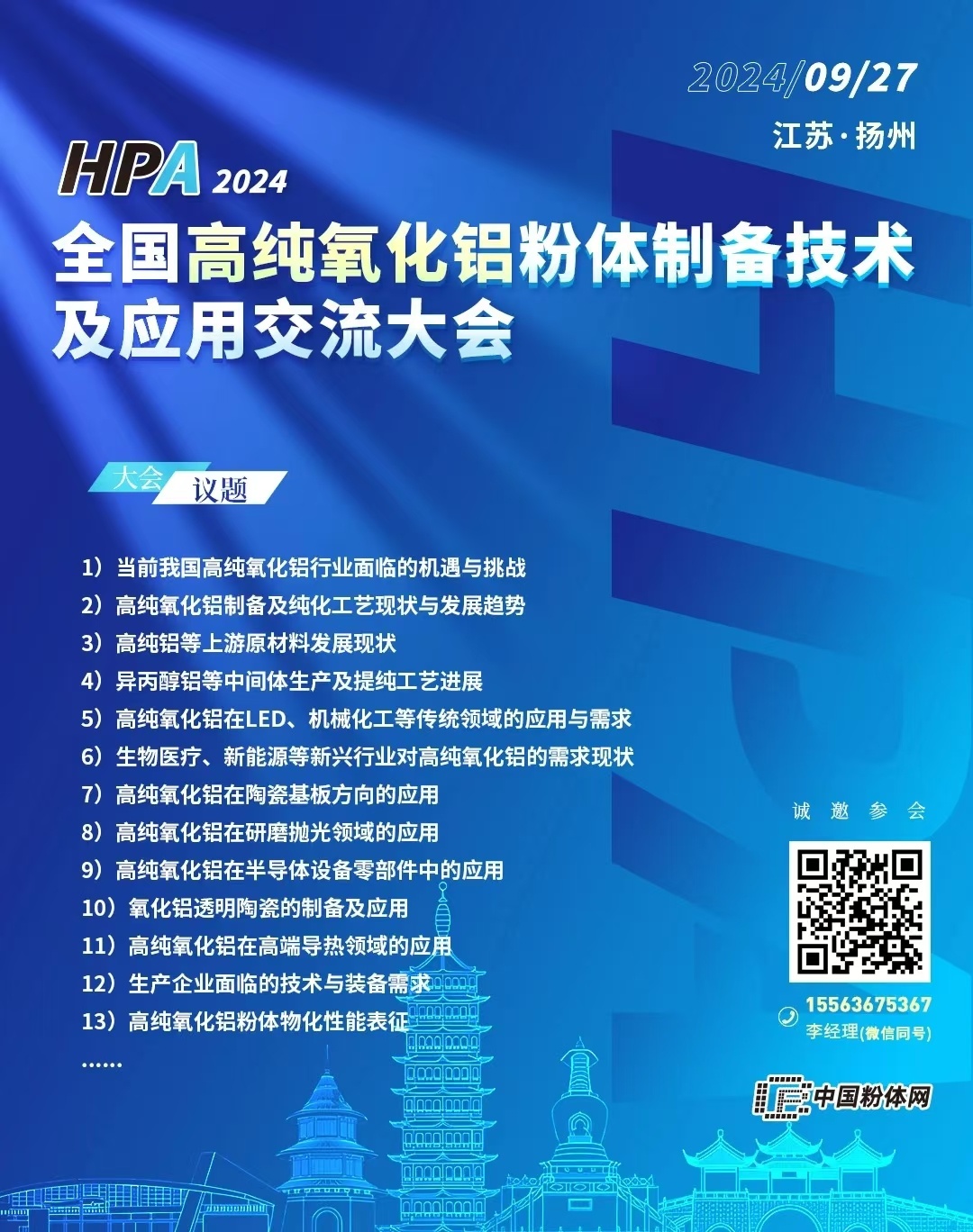 中國粉體網(wǎng)訊 高純氧化鋁粉體具有普通氧化鋁無法比擬的光、電、磁、熱和機械性能,是配套航天航空、半導體、核能、新能源、冶金、生物醫(yī)療、照明、機械、化工等眾多工程領域的重要新材料,是現(xiàn)代化工附加值最高、應用最廣泛的高端材料之一。在此背景下,中國粉體網(wǎng)將在江蘇·揚州舉辦2024全國高純氧化鋁粉體制備技術(shù)及應用交流大會,大會旨在搭建高純氧化鋁上下游技術(shù)交流、信息互通的溝通平臺,促進我國高純氧化鋁行業(yè)技術(shù)與產(chǎn)業(yè)發(fā)展突破。