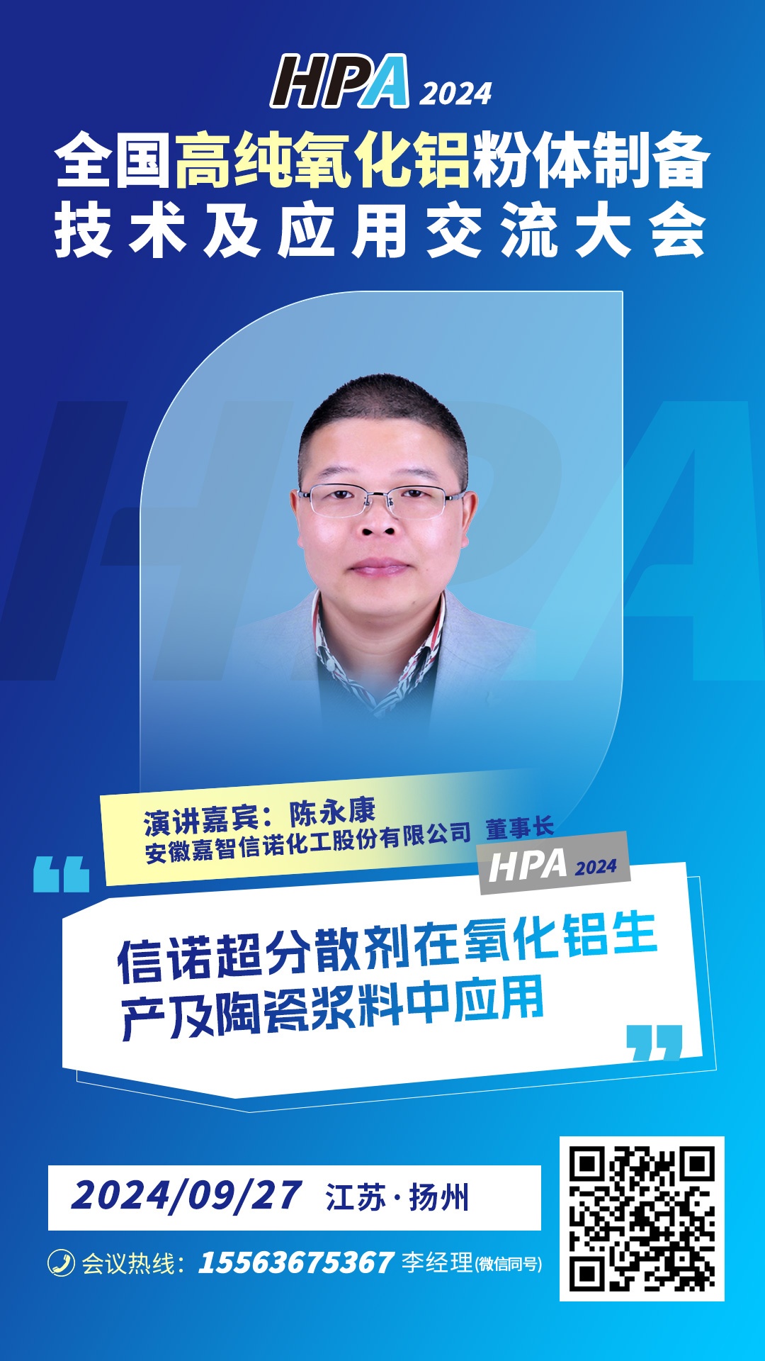 9月27日,中國粉體網將在江蘇·揚州舉辦2024全國高純氧化鋁粉體制備技術及應用交流大會。我們邀請到安徽嘉智信諾化工股份有限公司董事長陳永康出席本次大會并作題為《信諾超分散劑在氧化鋁生產及陶瓷漿料中應用》的報告。屆時,陳總將在演講中講解更多的陶瓷分散劑使用知識,以對您的實際生產提供一些指導和幫助。