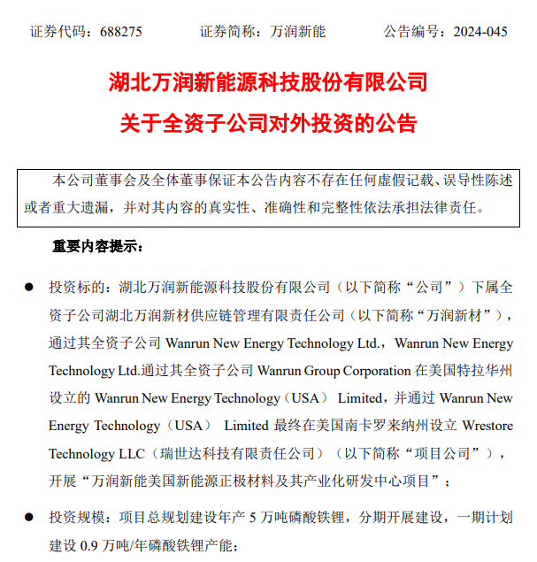 中國粉體網訊 9月23日晚間,萬潤新能公告稱,其下屬全資子公司湖北萬潤新材供應鏈管理有限責任公司計劃出資1.68億美元,通過一系列全資子公司最終在美國南卡羅來納州設立Wrestore Technology LLC,開展“萬潤新能美國新能源正極材料及其產業化研發中心項目”。