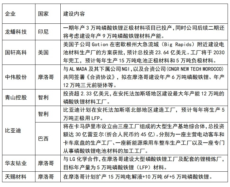 當前,海外市場磷酸鐵鋰正極材料布局尚處于初期階段,產能尚未釋放,陸續有材料廠看準時機出海建廠。據不完全統計,目前國內企業在海外規劃的磷酸鐵鋰產能已經高達60萬噸。