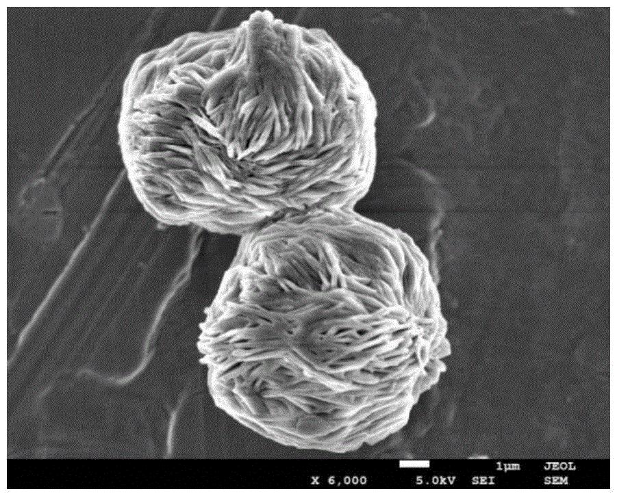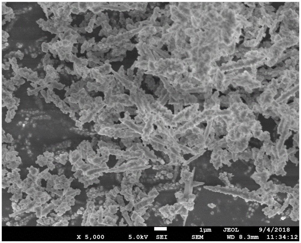 與現有技術相比,本發明方法制備的狼牙棒狀微納米碳酸鈣形貌均一,分散度良好,具有高長徑比,且其表面具有大量納米級微球與凸起,可用作橡膠、塑料、造紙、涂料等填料。也可作為基底材料,改性后進一步制備超疏水涂層。