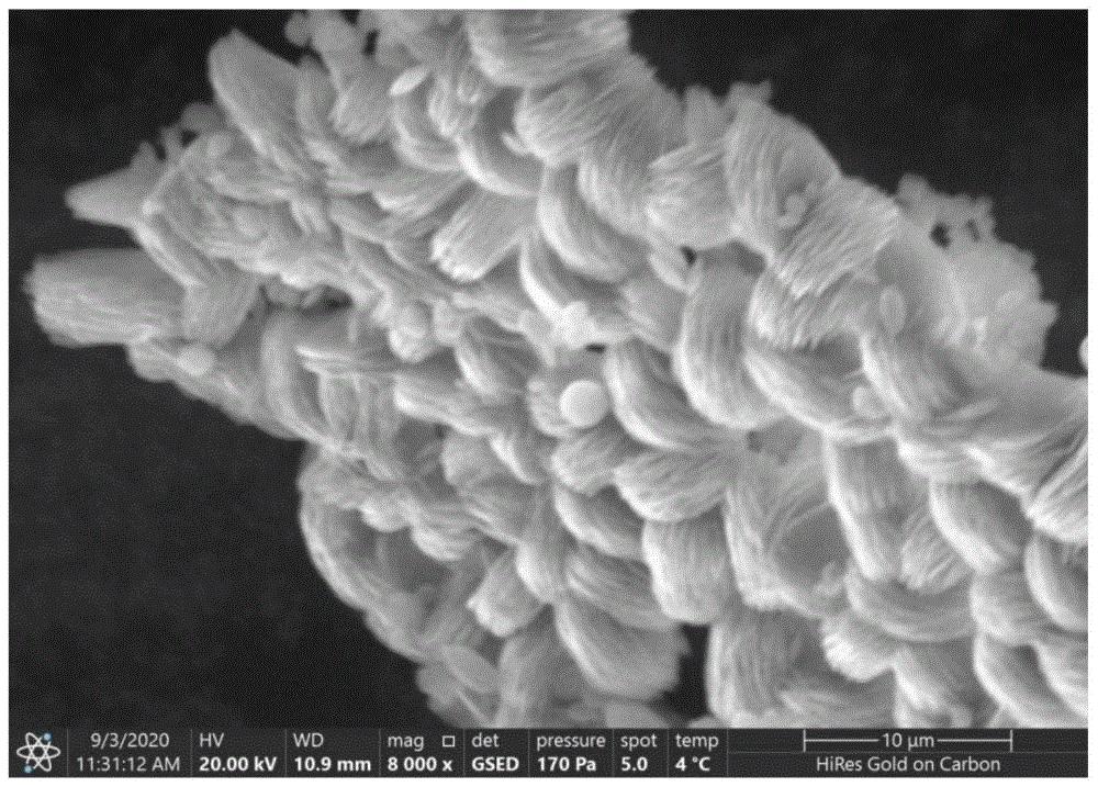 與現有技術相比,本發明的制備方法具有操作簡單、原料易得的優點,所制備的麥穗狀微納米碳酸鈣形貌均一,分散度良好,具有較高的比表面積。