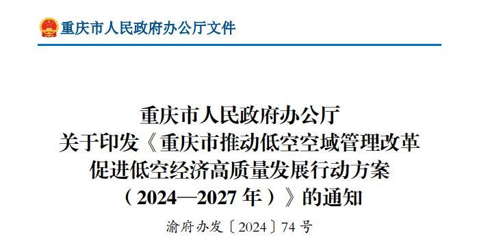 重慶市:《重慶市推動低空空域管理改革促進低空經濟高質量發展行動方案(2024—2027年)》