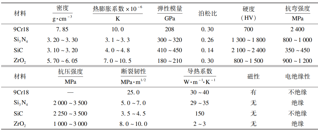 大量試驗(yàn)研究表明,工程陶瓷材料(氮化硅、碳化硅、氧化鋯、氧化鋁等)具有作為軸承基礎(chǔ)材料的優(yōu)良特性。其中,氮化硅是目前被認(rèn)為最適合用來(lái)制造高性能滾動(dòng)軸承的陶瓷材料。