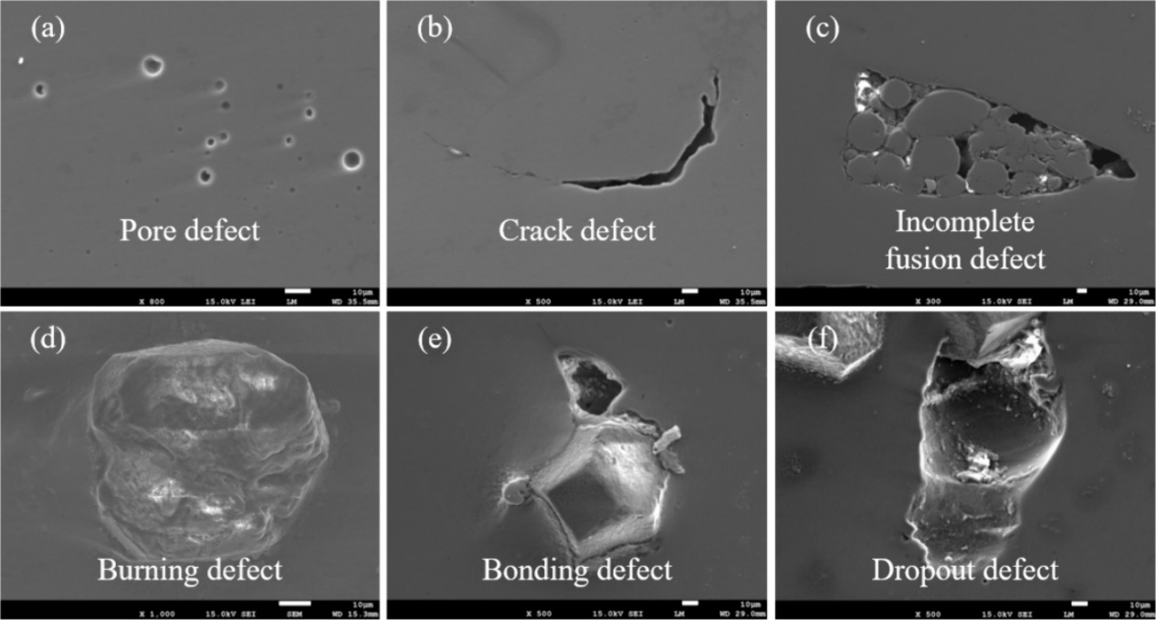 (4)金屬粘結劑的主要缺陷包括氣孔缺陷、裂紋缺陷和不完全熔合。對于金剛石磨料,主要缺陷包括燒傷缺陷、粘結缺陷和脫落缺陷。隨著金剛石晶粒尺寸的減小,3D打印金剛石工具中缺陷的大小和數量有增加的趨勢,這可以解釋為什么相對密度和力學性能會隨著金剛石晶粒尺寸的減小而減弱。