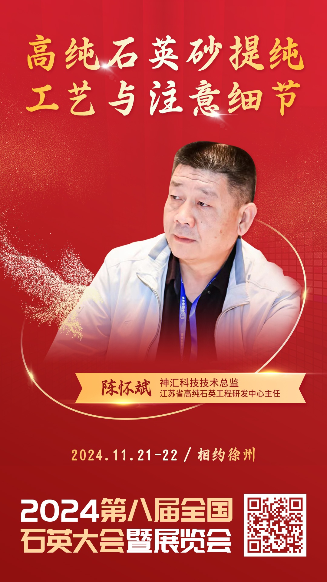 2024年11月21-22日,由中國粉體網主辦的“2024(第八屆)全國石英大會暨展覽會”將在江蘇徐州召開,江蘇省高純石英工程研發中心主任、神匯科技技術總監陳懷斌將做《高純石英砂提純工藝與注意細節》的報告。屆時,他將結合多年高純石英從業經驗,詳細解讀高純石英提純理念以及在高純石英提純時需要注意的種種細節。