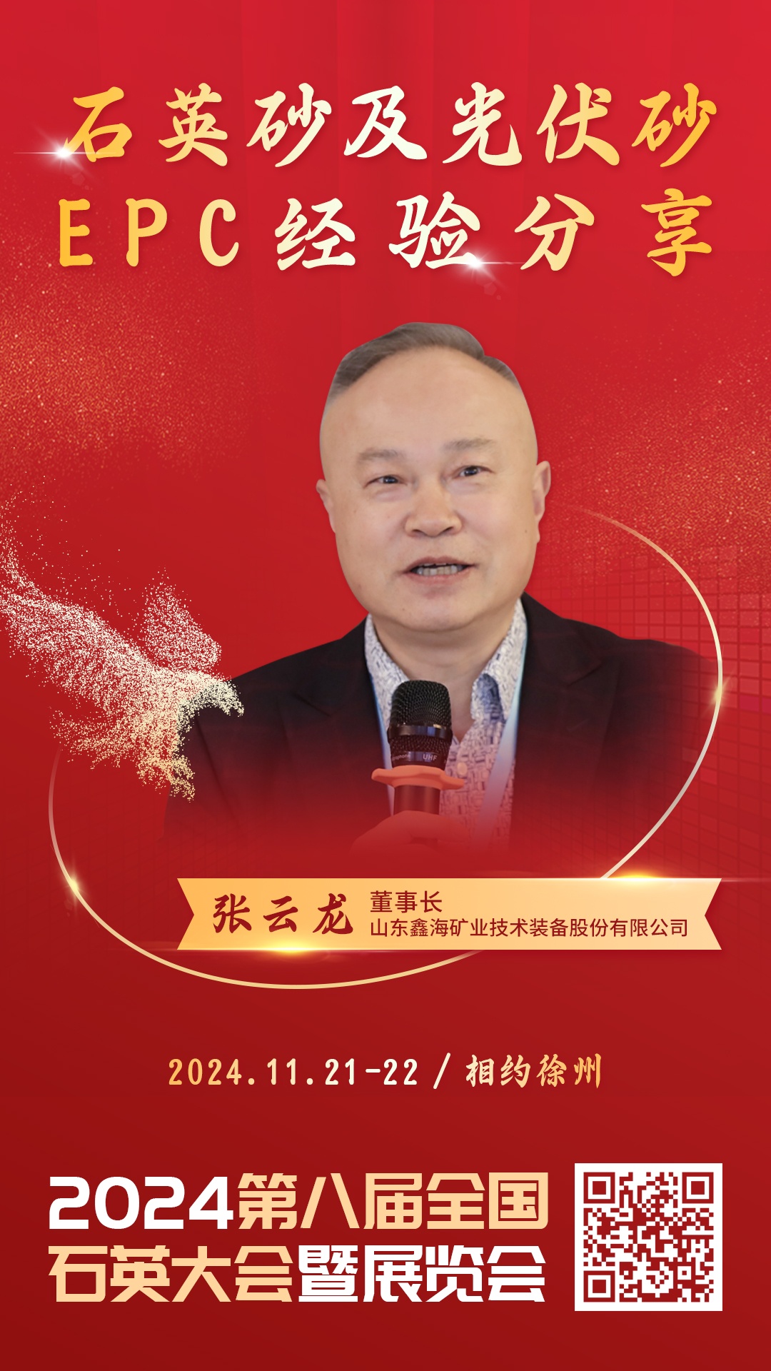 2024年11月21-22日,由中國粉體網主辦的“2024(第八屆)全國石英大會暨展覽會”將在江蘇徐州召開,山東鑫海礦業技術裝備股份有限公司的董事長張云龍將做《石英砂及光伏砂EPC經驗分享》的報告,屆時,他將結合公司產品應用案例,詳細解讀石英砂及光伏砂EPC經驗。