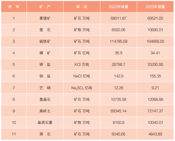 截至2023年底,中國菱鎂礦儲量較2022年底增長2.2%,螢石儲量增長24.4%,鉀鹽儲量增長15.3%,鈉鹽儲量增長8.7%,重晶石儲量增長12.4%,高嶺土儲量增長4.0%,晶質石墨儲量增長23.9%。