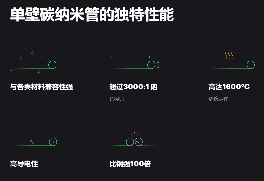 值得一提的是,單壁碳納米管的添加不僅能夠增強并提升相關材料的使用壽命,還能顯著提高能源利用效率,為實現零碳未來做出直接貢獻。僅在電動汽車產業這一項應用中,在電池和輪胎中添加單壁碳納米管,就可以將產品整個生命周期的二氧化碳排放量減少8%。