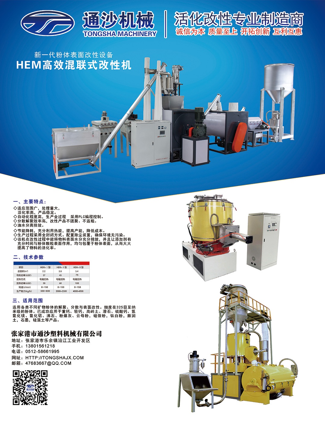 張家港市通沙塑料機械有限公司是國內生產粉體改性機械的企業。公司與全國十多所?圃盒B摵祥_發新型材料。公司是改性協會常務理事單位之一。從事非金屬礦粉體表面改性及相關深加工與工藝的研究。